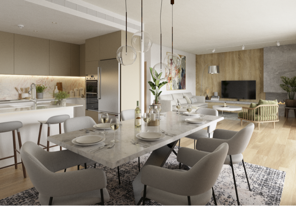 Τέσσερα οικογενειακά διαμερίσματα τριών ή τεσσάρων υπνοδωματίων σε 4 επίπεδα με εξαιρετική διαρρύθμιση και σύγχρονο design.